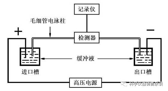 毛细管电泳仪的结构并不复杂,主要有高压毛细管柱、检测器,以及两个供毛细管两端插入而又可和电源相连的缓冲液槽。